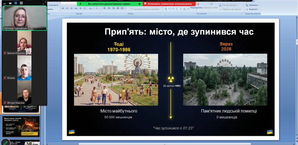 Присутні переглянули тематичний відеоролик про події аварії та ознайомилися з книжковою виставкою «Відлуння Чорнобильських дзвонів», де було представлено матеріали про історію трагедії, її наслідки та відображення в культурі.