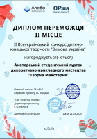 З метою створення умов для духовного і культурного розвитку, розкриття творчого потенціалу, виховання художньо-естетичних смаків у дітей і студентської молоді, популяризації різних видів творчої діяльності, сприяння збереженню національного мистецтва, виявлення та розкриття молодих талантів відбувся ІІ Всеукраїнський конкурс дитячо-юнацької творчості «ЗИМОВА УКРАЇНА». До участі у конкурсі долу..