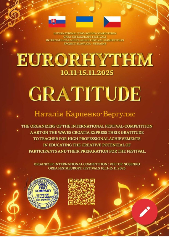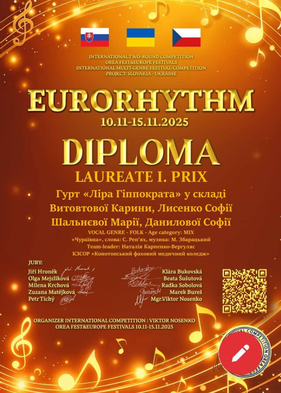 Вихованки вокального гуртка "Ліра Гіппократа" КЗСОР "Конотопський фаховий медичний коледж " ВИТОВТОВА Карина, ЛИСЕНКО Софія, ШАЛЬНЄВА Марія, Давидова Софія (керівник Наталія КАРПЕНКО - ВЕРГЛЯС) брали участь у Міжнародному двотуровому конкурсі мистецтв "ЄВРОРИТМ", організованому OREA FEST & EUROPE FESTIVALS. Проєкт Чехія-Словаччина- Україна проходив у листопаді 2025 року.