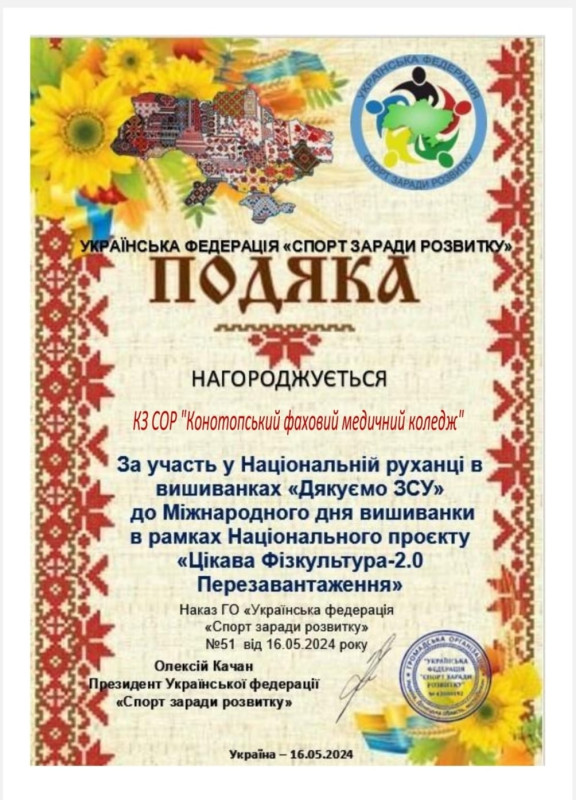 Українська федерація «Спорт заради розвитку» відзначила КЗСОР "Конотопський фаховий медичний коледж" за участь у національній руханці у вишиванках «Дякуємо ЗСУ», до якої доєдналися 742 362 учасники та 11 206 закладів/ педагогів в рамках проєкту «Цікава фізкультура - 2.0. Перезавантаження".