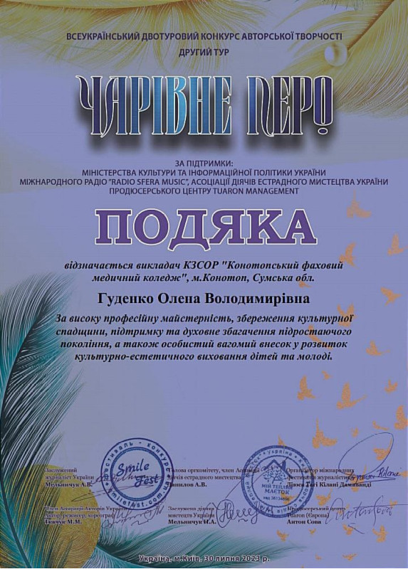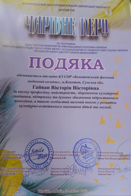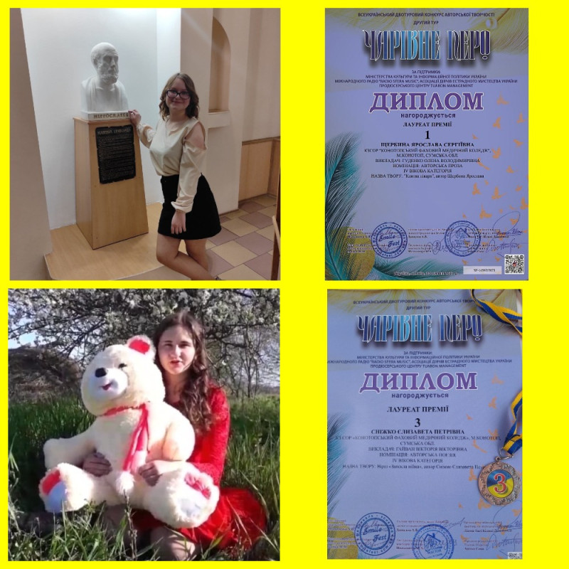 Здобувачки освіти КЗ СОР «Коноторський фаховий медичний коледж» спеціальності 223 Медсестринство Ярослава ЩЕРБИНА ( гр.2Бф) та Єлизавета СНІЖКО ( гр.3мс) брали участь у І Всеукраїнському двотуровому конкурсі авторської творчості "ЧАРІВНЕ ПЕРО".