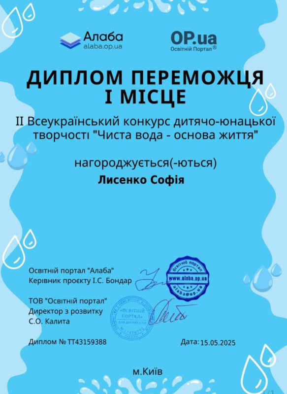 ПЕРЕМОГА У ІІ ВСЕУКРАЇНСЬКОМУ КОНКУРСІ ДИТЯЧО-ЮНАЦЬКОЇ ТВОРЧОСТІ "ЧИСТА ВОДА - ОСНОВА ЖИТТЯ"