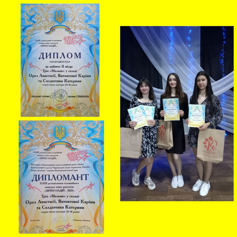 Вітаємо тріо "Мальви" у складі Орел Анастасії , Солдатенко Катерини, Витовтової Карини, здобувачок освіти КЗ СОР "Конотопський фаховий медичний коледж", учасниць конкурсу та Гала-концерту, лауреаток XXIII- го регіонального телевізійного конкурсу юних вокалістів "ЗІРКИ НАДІЙ-2023". За результатами конкурсу тріо "Мальви" закладу освіти нагороджено дипломом ІІ ступеня, а Витовтова Карина (соло)- дипломом І ступеня (старша вікова категорія).