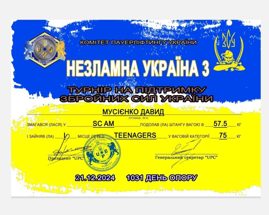 у своїй ваговій категорії по строгому підйому штанги на біцепс та виконав норматив КМС( кандидата у майстри спорту).