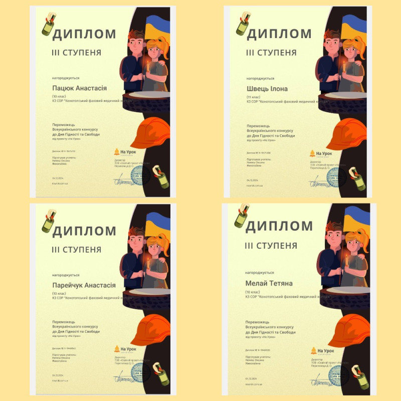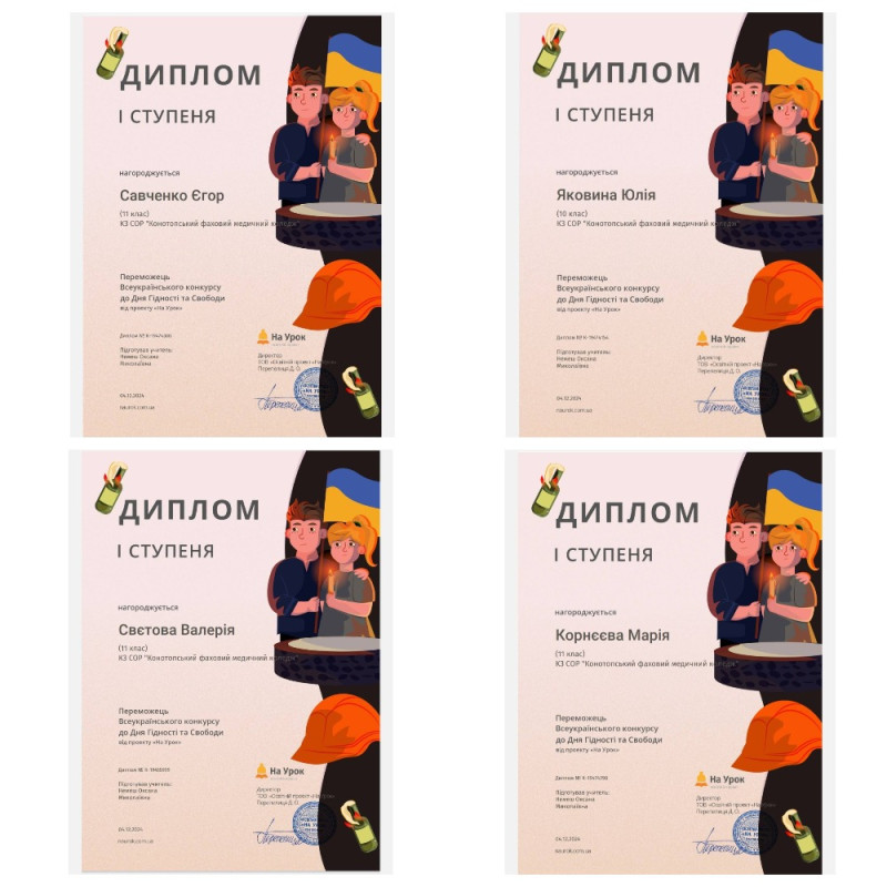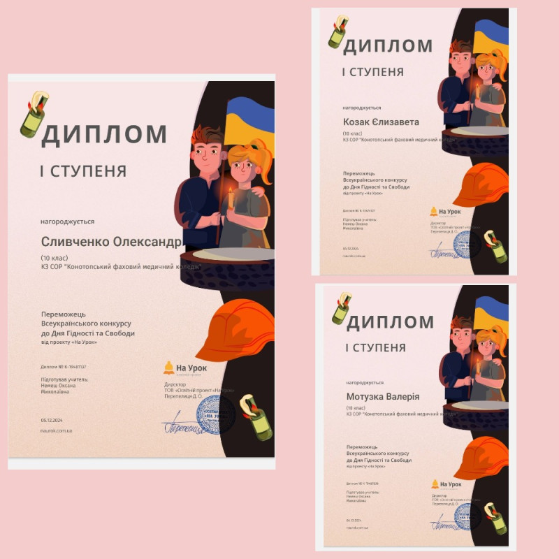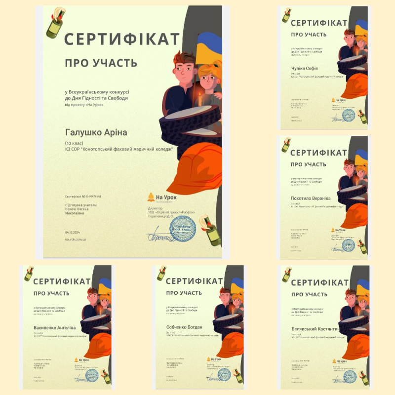 Цьогоріч здобувачі освіти КЗСОР "Конотопський фаховий медичний коледж" активно долучилися до онлайн конкурсу, який приурочений одній з найважливіших дат в історії сучасної України — Дню Гідності та Свободи та посіли призові місця.