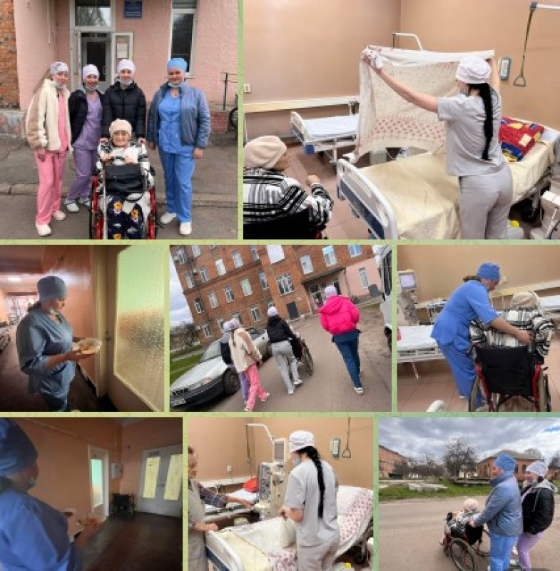 Майбутні медики сумлінно відпрацьовують набуті навички: роздача їжі, годування важкохворих, транспортування пацієнтів, заміна натільної та постільної білизни та інше. А головне – це спілкування з пацієнтами, виявлення турботи та співчуття до людей з обмеженими можливостями.