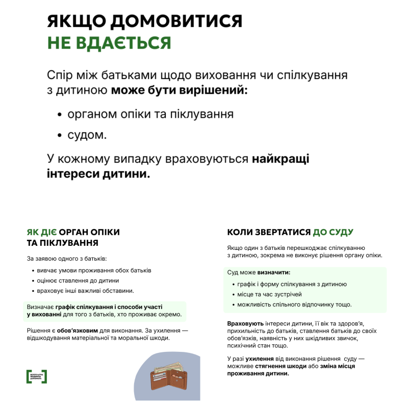 Мати та батько мають однакові права та обов’язки щодо дитини, незалежно від того, чи були вони у шлюбі, чи ні. Розлучення або окреме проживання — не скасовує батьківських прав. Дитина залишається спільною, а виховання — спільним обов’язком. Той із батьків, хто живе окремо, має право брати участь у вихованні та спілкуватися з дитиною, а інший не має права цьому перешкоджати, якщо це не шкодить дитині.