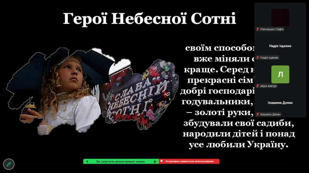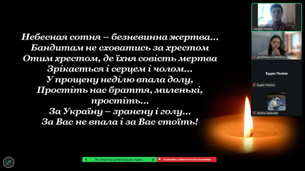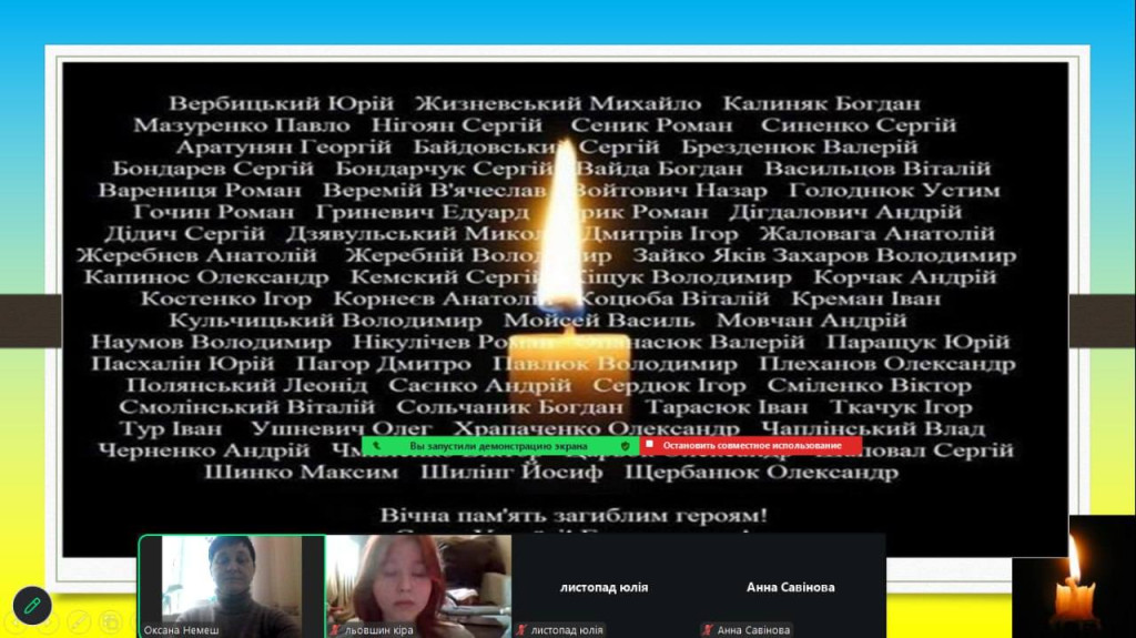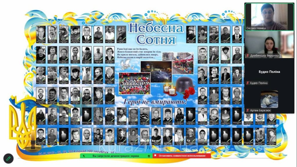 Сьогодні у бібліотеці коледжу було оформлено тематичну виставку "Герої не вмирають ..... Просто йдуть ..... з Майдану в небо....".Для студентів - першокурсників проведено тематичну онлайн лекцію- бесіду, присвячену Дню Героїв Небесної Сотні. Під час спілкування студенти згадали хронологію подій зими 2013–2014 років, переглянули інформаційні матеріали, вшанували пам'ять загиблих Героїв хвилиною мовчання, обговорили значення громадянської позиції та відповідальності кожного за майбутнє України.